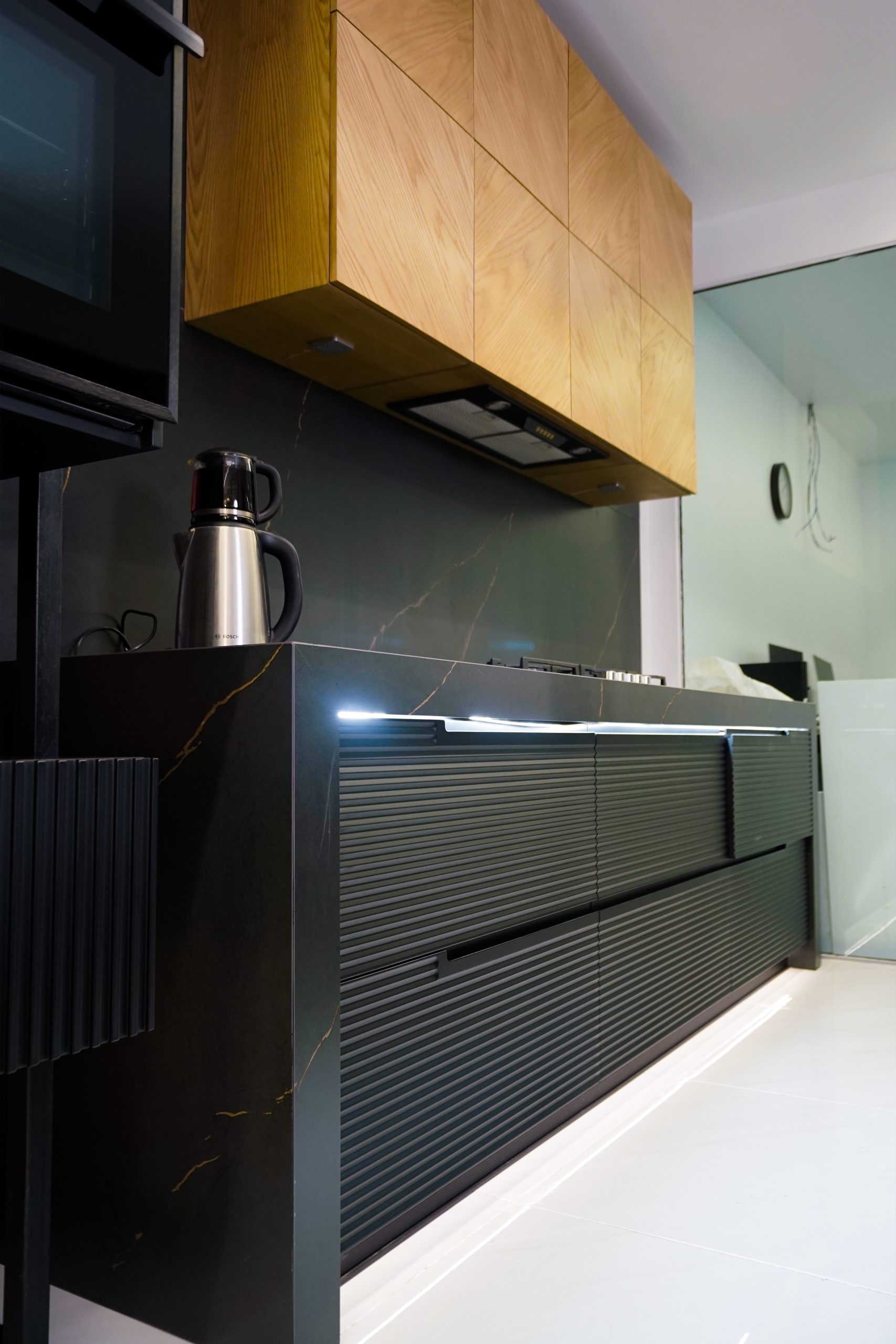 بازی با هندسه خالص: تمام تأکید روی خطوط تمیز، بُرنده و مستقیمه. انگار یک مهندس با خطکش و گونیا، آشپزخونه شما رو دیزاین کرده. نتیجه؟ یک نظم بصری خیرهکننده.